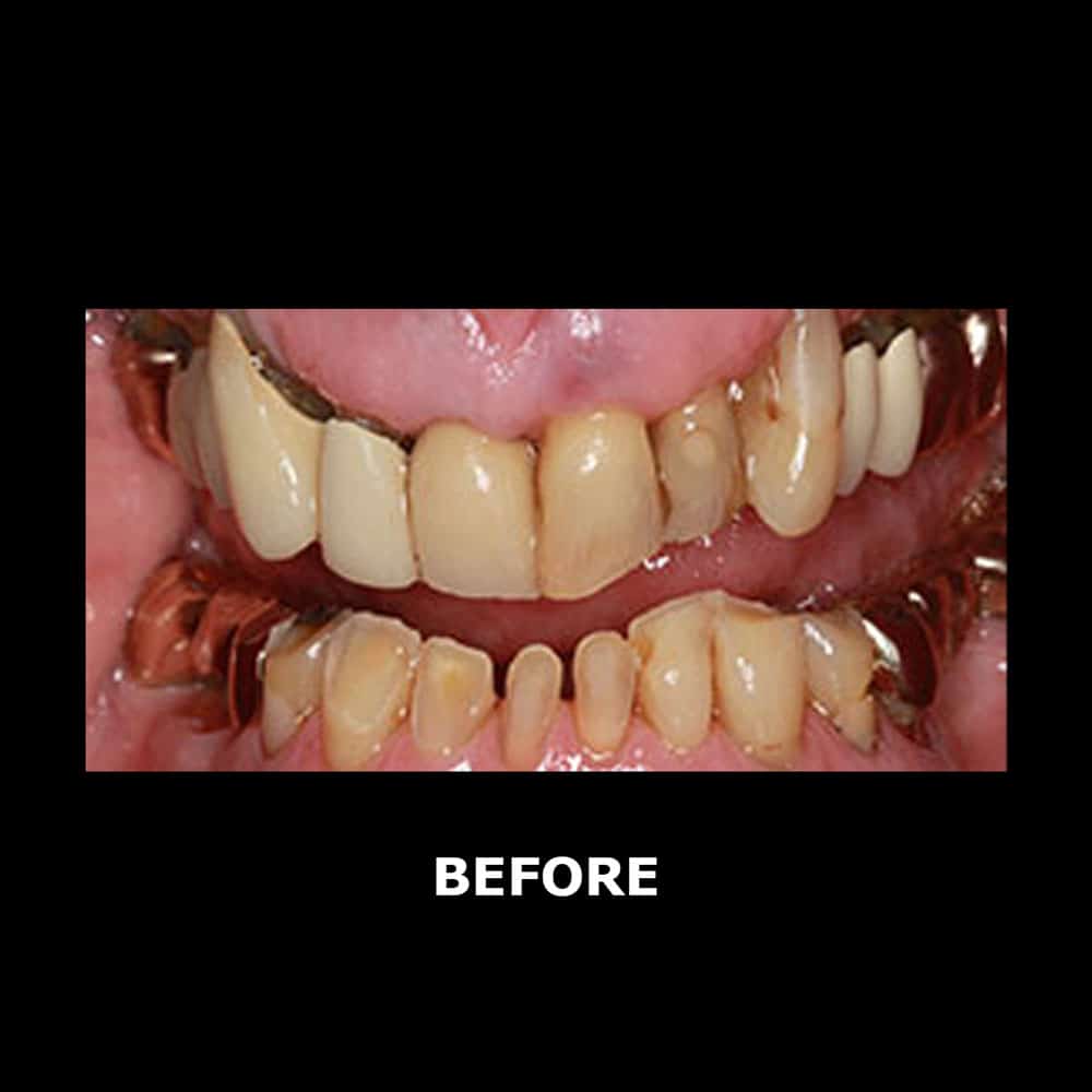After a comprehensive exam, we created a full-mouth rehabilitation plan that included extractions, new crowns and bridges, gum therapy, and dental implants to restore both strength and stability.