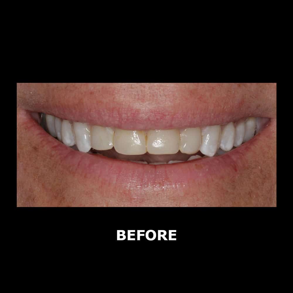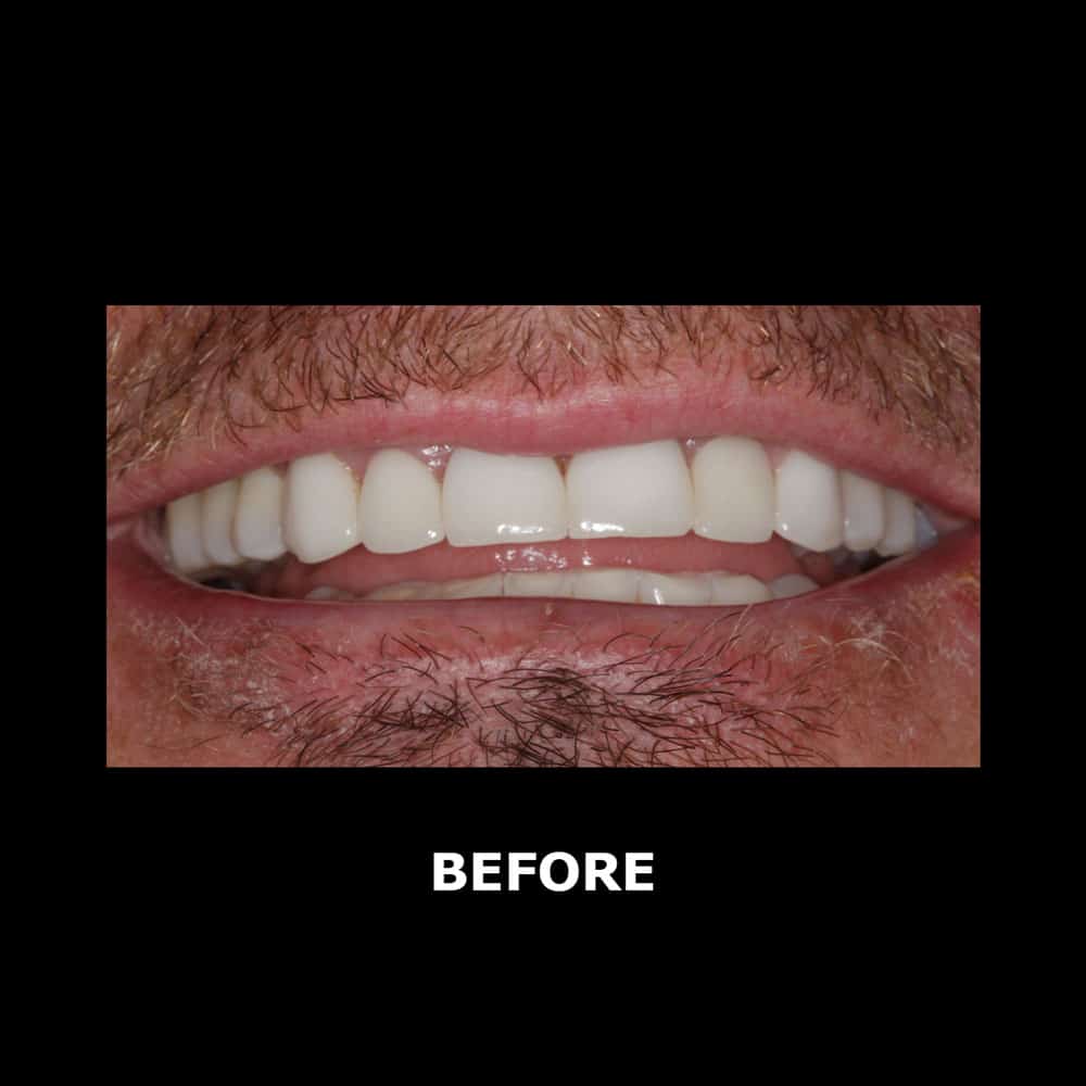 John came to us with concerns about his previous cosmetic work not holding up. Restorations were fracturing, and John mentioned he never really felt like he could bite on his back teeth. While his teeth were straight and in a good position, we needed to address the bite on his back teeth to ensure new work on the front teeth held up and had some longevity. We did composite bonding on his back teeth and porcelain crowns on his six front teeth.