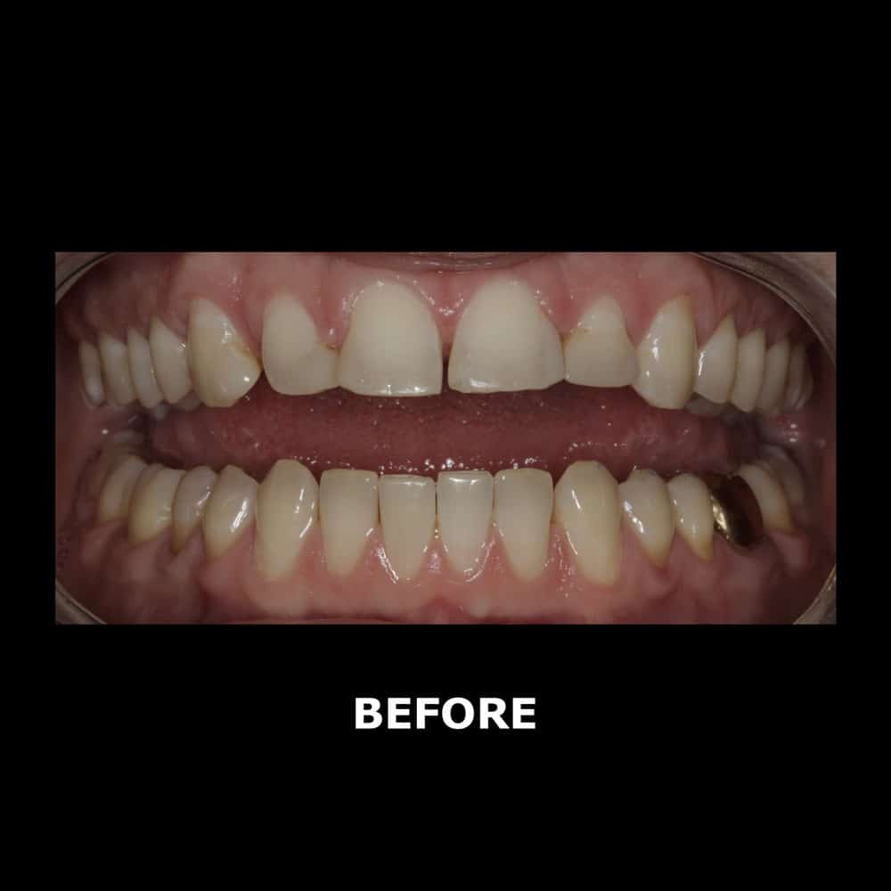 To close the space and create natural-looking symmetry, we used a combination of Invisalign® to move his teeth into alignment, porcelain veneers to refine the shape, and whitening to brighten his smile. Porcelain crowns and implants restored both appearance and long-term function.